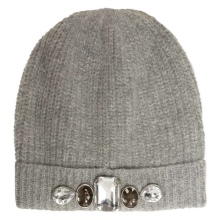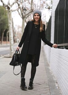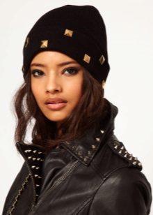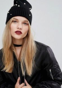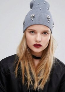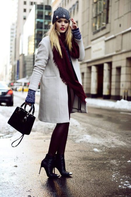 - In this outfit, a shiny beanie hat decorated with showy stones complements a simple everyday look. A melange sweater, leather leggings, a light classic coat and high-heeled ankle boots. Do not forget about the light wine-colored scarf that sets off the color of lipstick.