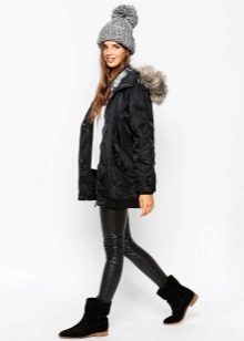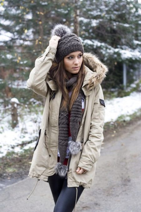 - The casual look is decorated with a very feminine and elegant set, consisting of a textured knitted hat and a taupe scarf. Comfortable leggings, a sweater and a warm parka are perfect for everyday wear. The ideal solution for the winter season.