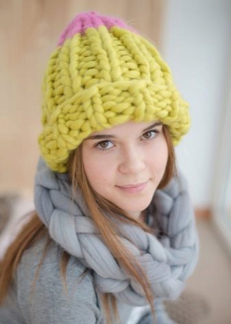 More recently, fashion designers presented to the public a large knit hats made of multi-colored yarn. The technique for creating yarn is simple - the thread is either randomly dyed in different colors or multi-colored fragments of other materials are superimposed on it. Due to this, original coloristic solutions are created, an unusual texture is attached to the yarn.