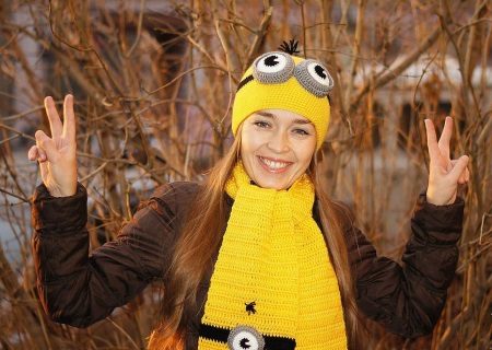 The first girl shows us a cheerful spring look in the style of minions. A set of knitted hats and a yellow scarf with the addition of character attributes (eye with glasses and “hairstyle”) rejuvenates the heroine of the photo, demonstrating her friendly character and openness. To such bright accessories, she picked up a dark jacket that goes well with funny faces.