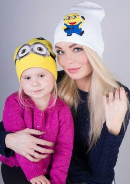 The woman and her daughter are fans of cheerful characters, as well as lovers of wearing pair of clothes. In this case, the theme on the synthetic hats is similar, but the images of the yellow favorites of the children are executed in different ways: my mother has a whole minion on a light background, as in a cartoon, and the girl’s headdress only contained his expressive eyes on a yellow background. Such a tandem will not go unnoticed on a joint walk in the park.