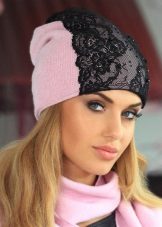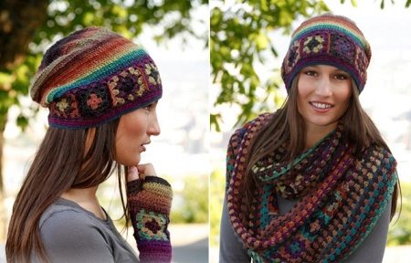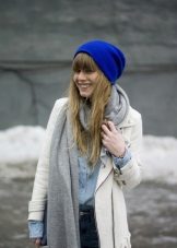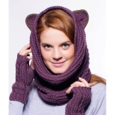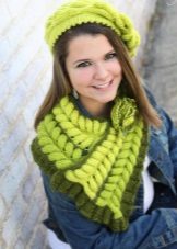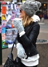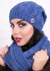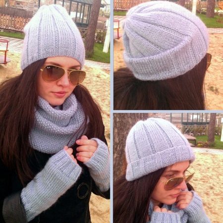 A fashionable beanie hat can be worn in various variations - without a lapel, leaving a protruding top, with a single lapel and with a fold at the back of the head. The ensemble of a hat, mitts and a snood of the same color looks great.