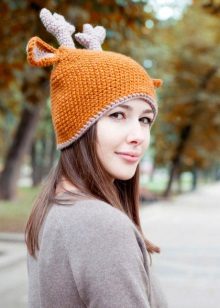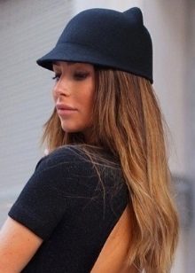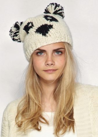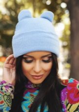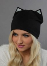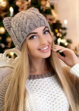 Girls love funny beanies with animalistic ears., mainly feline and bear-pandas.Such ears are decorated not only with knitted woolen hats, but also with fashionable felt jockey caps. Lovers of beautiful complex styling often prefer a scarf hat, under it, the hairdo is not crumpled as much as under the usual hat, but such an accessory looks quite fashionable and modern and feminine.