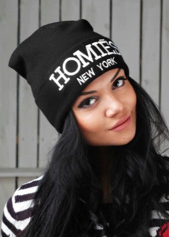 Large inscriptions adorn youth sports and urban models. The inscriptions are located on the side or front of the forehead. Often letters are used in contrasting colors, embroidered with stones and rhinestones.
