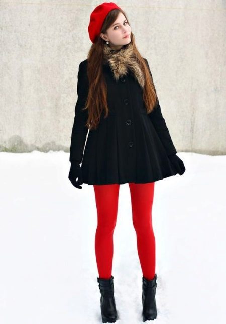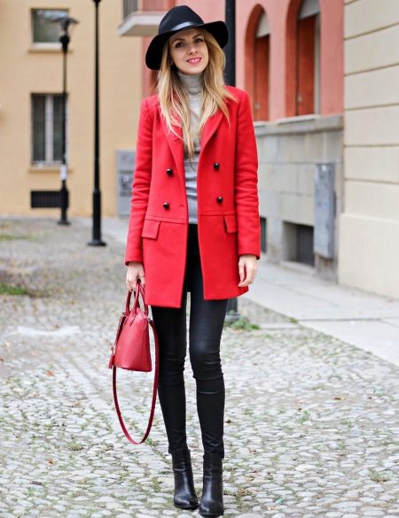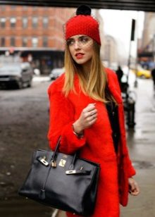 Red coat with a black hat or beret, as if created for each other. This combination will create a chic look for any woman, the main thing is to choose them correctly to each other in form and texture. The red coat itself is bright and expressive, so do not overload it with a bright and too decorative headdress. White, milky and all shades of gray from light gray to the color of wet asphalt are suitable for red.