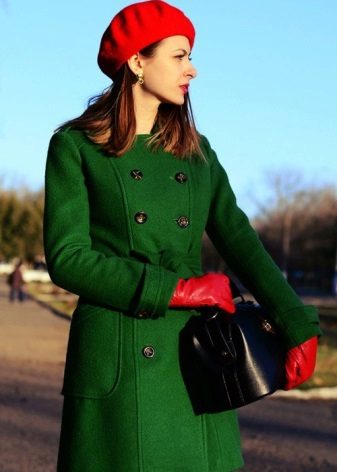 With a green coat perfectly combine red, light sand color and a variety of shades of brown. There is much debate about the combination of red and green colors in clothes, but the combination of a dark green coat with a red beret, burgundy or garnet beret looks successful and extraordinary. In the photo, the green draped double-breasted coat harmonizes beautifully with the bright red beret, leather gloves of the same tone complement the image.