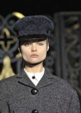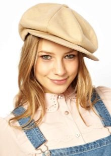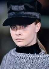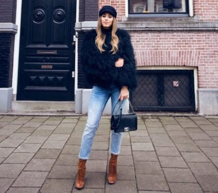 A stylized cap made of suede with a visor will always look stylish and fashionable. An effective image with her participation can be created in a bow with a fluffy artificial fur coat of a dark shade and light jeans at a high waist. Shoes should be chosen in a neutral brown color with a steady heel, and from accessories, choose a small clutch in the tone of a cap on a long strap. You will get an elegant image of an urban style in which you can go on a fun walk with friends or a business meeting.