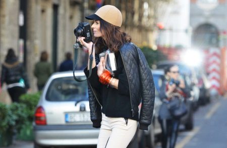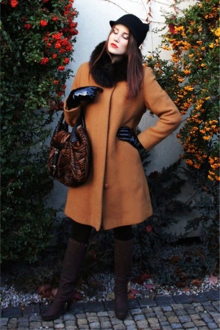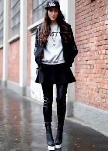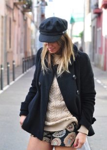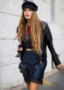A leather cap with a visor of a classic look is able to radically change any image. It is absolutely not necessary to combine it only with the military style; you can try to create with it a bright and quite elegant, feminine image. To do this, complement the look with a double-breasted black lightweight coat, worn over a bright or spectacular feminine dress. Pay attention to the accessories - they should match the style of the headgear. In this case, it will be nice to complement the image with high leather boots and a voluminous clutch to match them and the dress.