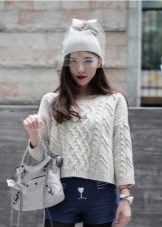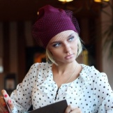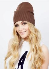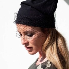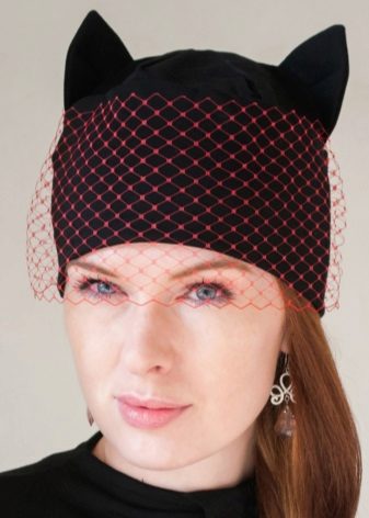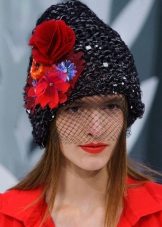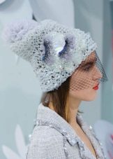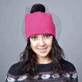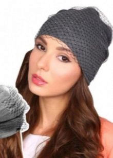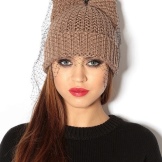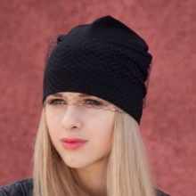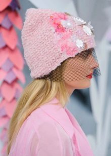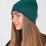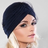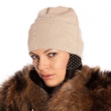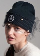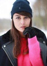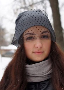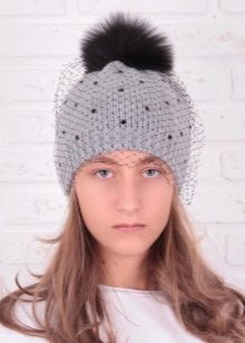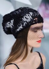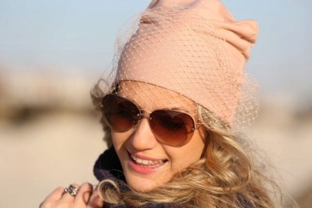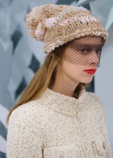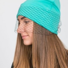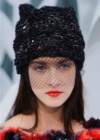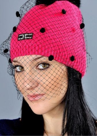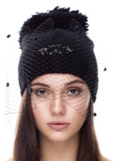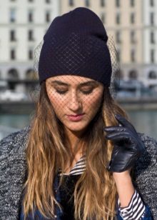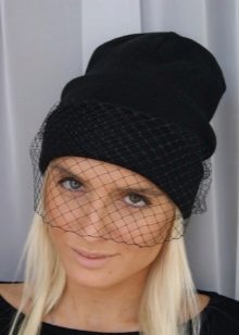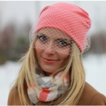 - The material from which the caps with a veil are made may be different. In stores, there are knitted, cashmere models, styles from large bulk knitting. Variety will help you choose the right option for any weather conditions