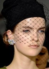 A photo from a fashion show is a good example of how large jewelry is combined with a hat with a veil. They do not enter into dissonance, do not interrupt each other, but rather serve as an excellent complement to the image.