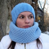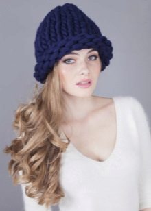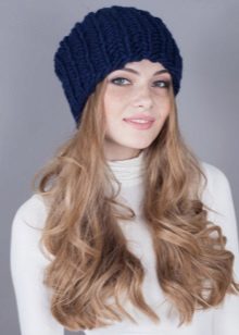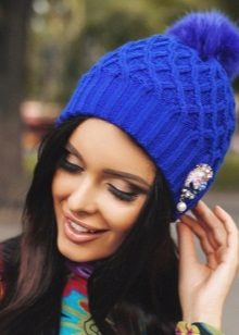 Blue hats made of thick wool yarn are very popular. Original patterns will help to add charm and creativity. It is worth paying attention to blue hats with such exquisite patterns as “ladders”, “bumps” or “pigtails”. Such a headdress looks great in tandem with snoods or scarves in a single color scheme.