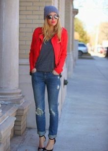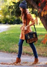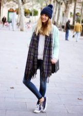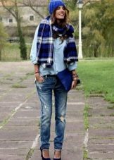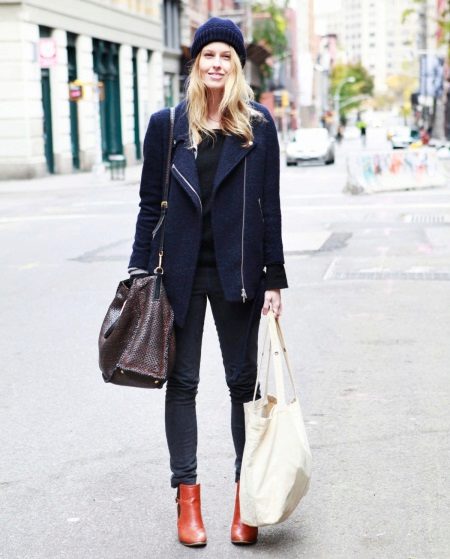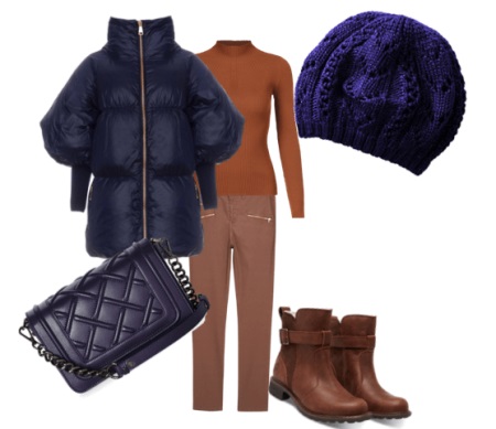 Blue color looks beautiful in combination with red and brown tones. The hat and blue down jacket look beautiful. When choosing shoes, it is better to give preference to brown boots, but a sweater and jeans can be darker or lighter than the color of the shoes. A clutch bag in the tone of a hat will never be superfluous.