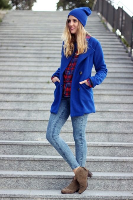 For the embodiment of a stylish bow for every day, you should give preference to a cap-toe bright blue. She looks harmonious with a short coat in the same color scheme. A perfect complement to an irresistible everyday look will be a red and blue checked shirt, tight-fitting jeans and suede ankle boots in a light brown color.