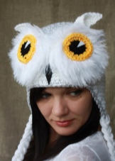 - A white hat owl will give the appearance of tenderness, peace. This option is suitable for the winter period. The contrasting eyes of the owl does not allow the product to merge with the surrounding snowy nature.The bow forms the New Year’s atmosphere, so the owner of the hat will always experience fabulous sensations, which were only in childhood.