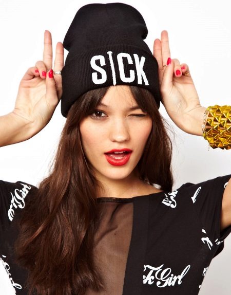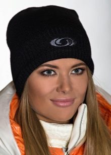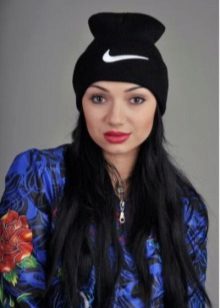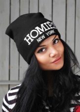 - Very fashionable youth model of a sports hat in black with a large inscription in front. The inscription is made in contrast - white. The sock model is suitable for free and independent girls leading an active lifestyle. This hat goes well with sports-style clothing (sweaters, sweatshirts, sweatshirts, jeans), short jackets and a sheepskin coat, an ultra-short fur coat. Despite the simplicity of execution and color scheme, this hat looks very stylish and feminine.