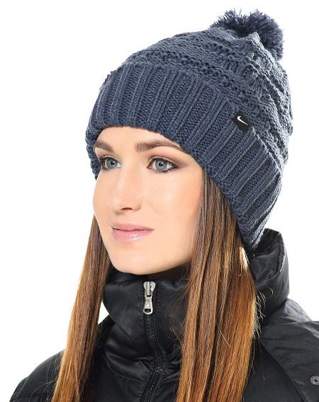 Knitted sports hat with a big pompom is perfect for all ages, not only for youth. Model in the form of a cone on a wide elastic band with a lapel, textured knitting, saturated gray-carbon color. The quality and manufacturer are reminiscent of a laconic small Nike logo in front on the lapel of the cap. Such a hat can be worn with sports-style jackets, with a down jacket and even with a fur coat.