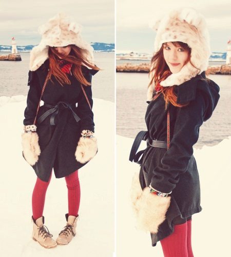 - An interesting combination of a black felt coat of asymmetric cut and red dense striped tights will perfectly complement the cream-colored fur hat with decorative bear ears. It is worth noting that a thin belt at the waist gives the image femininity, and fur mittens of the same shade perfectly complement the hat.