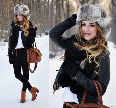 A cropped black sheepskin coat looks very harmonious with a gray fur hat with earflaps. The product looks restrained and stylish thanks to the “ears” tied at the back of the head. A brown bag and boots will become a bright spot in the image, and in addition a black knit scarf will perfectly suit.