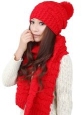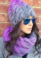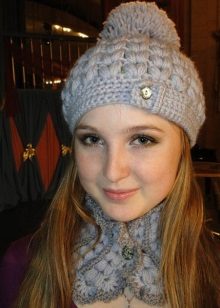 A charming set of tight-fitting hat and a massive yarn scarf is made of thick yarn. The headpiece is connected with a fashionable “braid” pattern, which looks especially advantageous in light lilac color. This figure makes the hat more voluminous, which is in harmony with the large facial features of the girl. The chic fur collar of outerwear adds to the ensemble of chic.