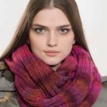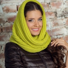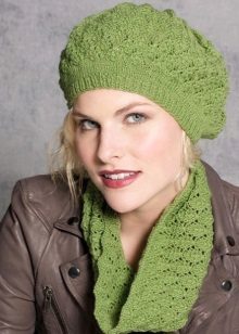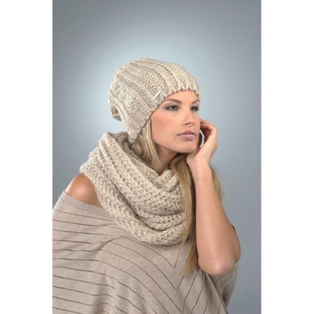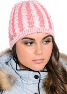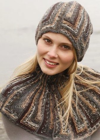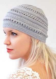 Caps connected by transverse or diagonal stripes look interesting, This is especially true for volumetric models - a hat-clamp, or snood. In the first case, several rows are knitted with stocking, and then, on the place of the front loops, the wrong ones are made and the next several rows are knitted according to the pattern - this gives the required number of strips, which can be of different thicknesses. Knitting diagonal stripes is not much more difficult, the basis of the pattern is the alternation of the front and back loops, which gradually shift with each subsequent row.