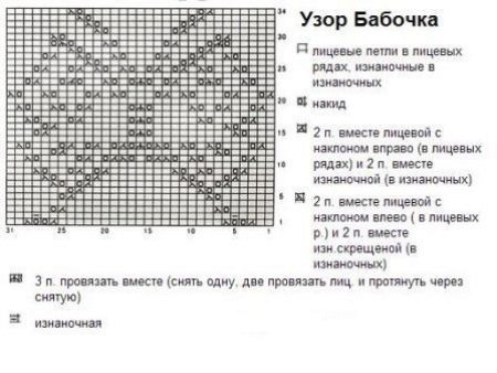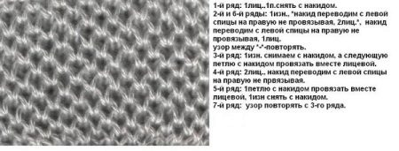 In the first row, all the loops are knitted face. In the second - facial alternate with the yarn, the row should be finished with just a loop removed. In the third row, the front and removed non-knit double crochets are knitted alternately, you need to finish the row with the front loop. The fourth row begins with a crochet, we remove the next loop without knitting, we knit a crochet loop with the front. In the fifth - we alternate two facial with a crochet. In the sixth, we knit the loop together with the crochet, then one crochet, one loop, without knitting, remove. The seventh row is executed as the third. Next is a repeat of 3-6 rows.