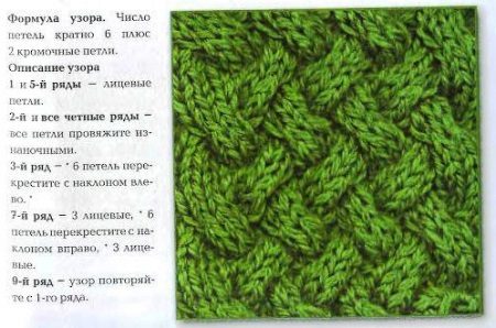 The popular “braid” pattern is somewhat similar to braids, but has a different order of intersections. In this example, the total number of loops is a multiple of six, excluding the edge. The initial two rows are hosiery. In the third row after the edge, every 6 loops we cross each other (3x3) so that a slope to the left is formed. We knit 4-6 rows according to the drawing. In the seventh row, we knit three facial loops, and then again, as in the third row, we cross every 6 loops, but now we are forming a slope to the right. We knit the eighth row according to the pattern, and starting from the ninth row, the pattern is repeated.