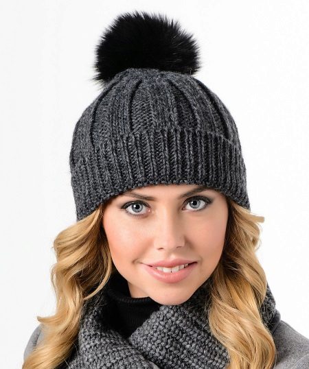 The cap fitting a head represents a combination of two types of elastic bands. The wide bar is made with a simple rubber band - in the form of alternating front and back loops (1x1). The main part of the product is connected by wide stripes. Concave strips of purl loops gradually disappear, approaching the crown of the cap, which is decorated with a black fluffy pompom made of natural fur. The knit of the headdress echoes the texture of the collar of the jacket, and the dark gray color is combined with the color of the girl’s eyes. The pompom is made in the same color as the sweater. All this as a whole creates a harmonious youth image.
