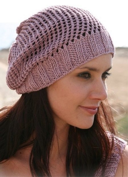 Elegant light beret is suitable for warm spring and early autumn. A pleasant shade of pink is combined with the girl’s hair and refreshes her complexion. The headpiece is made with an airy openwork mesh, and its edge is treated with an elastic band, which is a sequential alternation of two face and three purl stitches, which takes it. A carelessly shifted side takes, the girl’s clothes made of yarn of the same texture and color, her loose hair and a mysterious smile create a gentle romantic image.