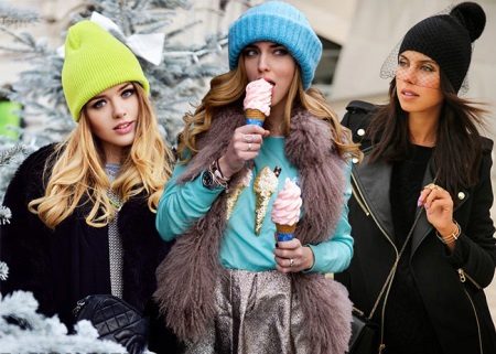 - Color type of appearance, growth and length of hair. When purchasing a hat (or material for its manufacture), pay attention to your own color type. It happens that both the shape of the cap and its style are perfect for the girl, but when put on, the effect of “disappearing face” or, as they call it, “you merge” is created. This is especially true of fur hats, selected in the same tone with hair and a fur coat. Brunettes are suitable for snow-white, lilac, red colors. Blondes - the whole pastel gamut, but you can experiment with more saturated colors. The classic black color of the cap can turn out to be quite insidious - such a shade requires an impeccable complexion, all of the imperfections (uneven skin, ugly complexion, bruises or bags under the eyes) it can highlight even brighter.