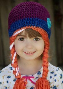 Funny hats for the little ones: a charming knitted hat with an image of the muzzle of an owl decorated with long braids. The second model is made in a combination of several bright, rich colors and decorated with funny ears. A great option for a baby 4-5 years old.