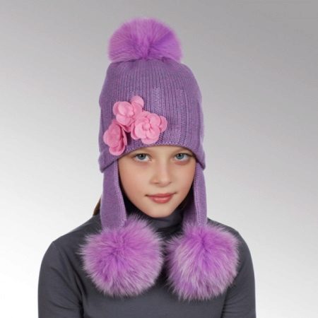 Pompons are one of the fashion trends of recent seasons. A neat lilac hat with long ears is decorated with 3 large lilac pompons. As an additional decor, a composition of three pale pink flowers was used. Such models are very often chosen by girls 8-10 years old or a little older.