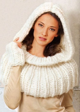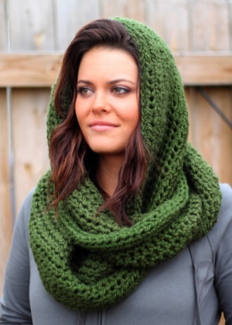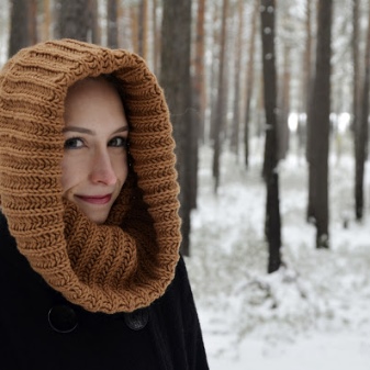 It can be of different lengths and volumes. The main way of its design is quite simple: the product is folded into the shape of a figure of eight and put on over the head. Then one of the rings is thrown over the head, turning the scarf into a headpiece that perfectly warms from the cold. This option carefully preserves the hair and protects not only the head from the wind, but also the shoulder body, back and chest. With a large length of the product perform an additional revolution around the neck.