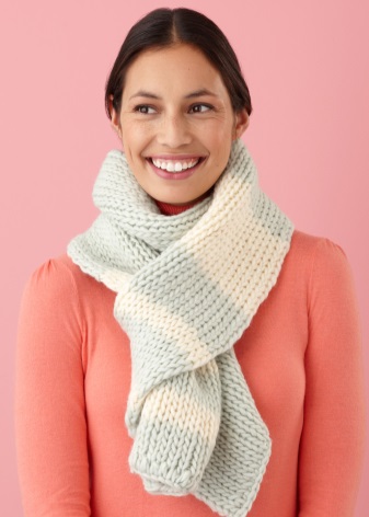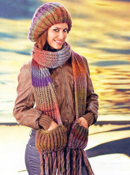 The accessory made of multi-colored yarn casting in different tones looks very impressive. This feature of threads allows you to create patterns of vertical and horizontal multi-colored stripes. This template harmoniously complements plain coats, down jackets, jackets. In this case, the color of the stripes usually echoes the main tone of the ensemble. There can be several shades, as a rule, this is a calm color group.