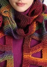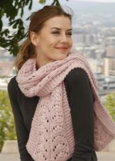 The last kind of knitting is the most difficult to perform. The composition of the picture of the craftswoman is often composed independently, since it is problematic to find the finished scheme. The most popular element of such scarves is openwork leaves, which are played out in various variations.