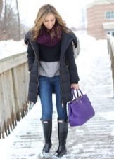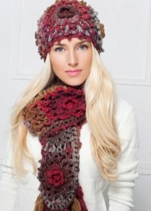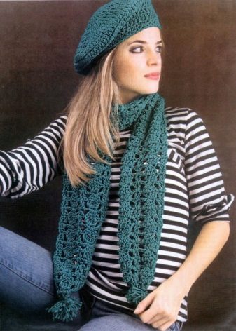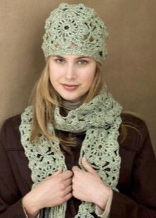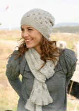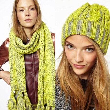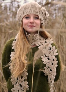 In color, the set of hat-openwork scarf can match with outer clothing or contrast with it. Comfortable uggs, boots or high-heeled shoes or a platform perfectly complement the look. Round off the ensemble with a practical leather handbag.