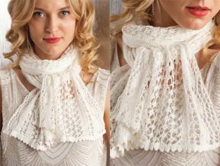 It should be noted an insignificant shortcoming of delicate openwork scarves - this is an unpresentable appearance of the wrong side, which can spoil the appearance of the accessory. Therefore, it is necessary to carefully lay and drape it around the neck, demonstrating only the beautiful front side.