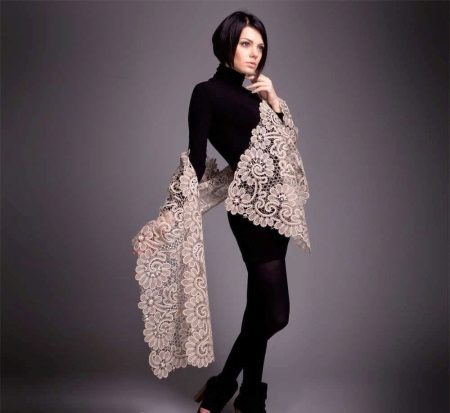 In spring and autumn, a light openwork scarf is successfully combined with a cotton cloak or a knitted cardigan. At the same time, a beret or felt hat will harmoniously look like a headdress. But in general, lace is most effectively combined with loose curls. From shoes, such an ensemble will be complemented by ankle boots or wedge boots.
