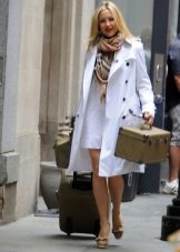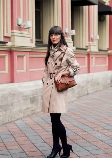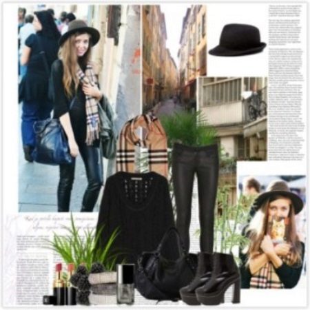 A black and white set of shirts and high leather pants is complemented by a beige classic trench coat and Burberry scarf in a famous plaid. As shoes, high-heeled ankle boots.