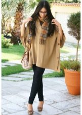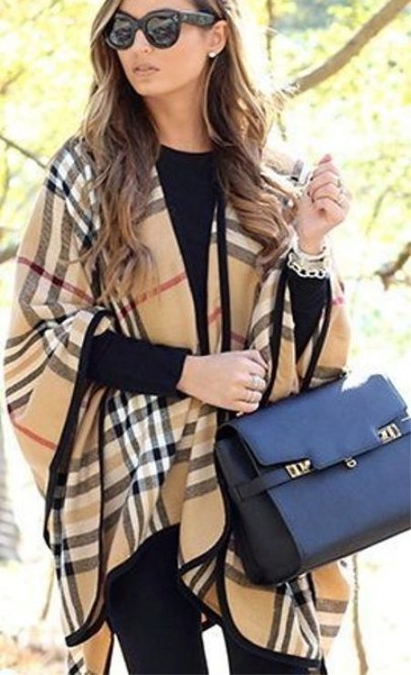 The stole can be worn instead of a jacket, and on a warm autumn day you will definitely not freeze. Under the stole black high-necked blouse, tattered black jeans. In addition black ankle boots, a bag. As an accessory, discreet earrings and sunglasses.