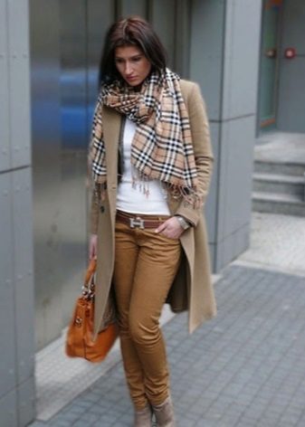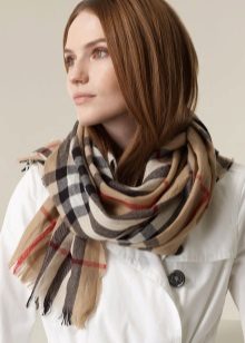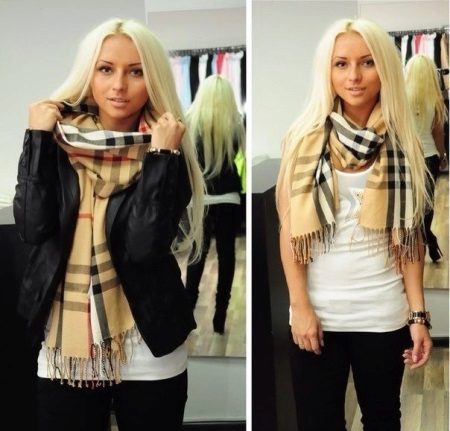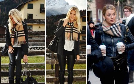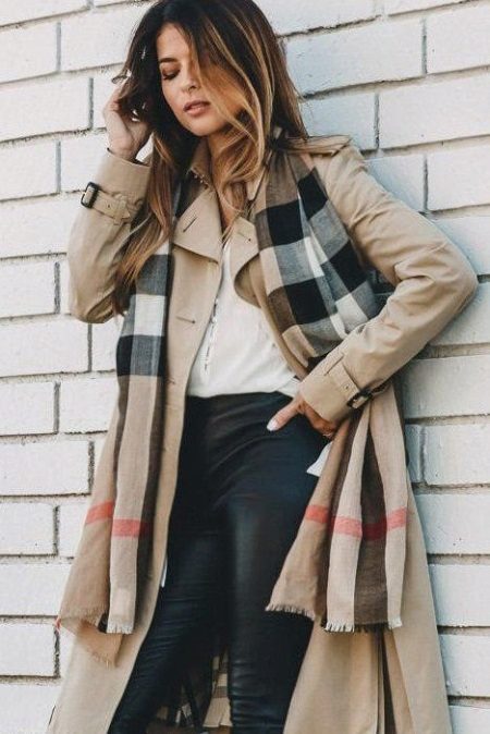 Winter and autumn scarves are most preferably worn with classic coat options, for example trench coats, straight and trapezoidal, fitted, and also with leather jackets. Plain scarves can be easily worn under and over jackets, down jackets, parkas. But if the product still has a cage or another pattern, then it is better to make it the main emphasis and not hide it. Burberry plaid scarves are not accepted.