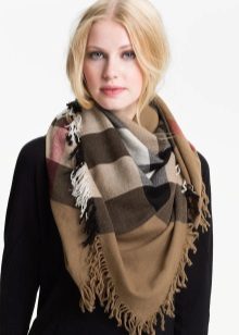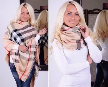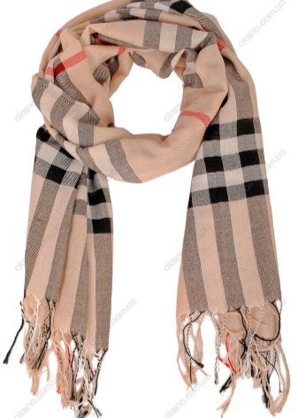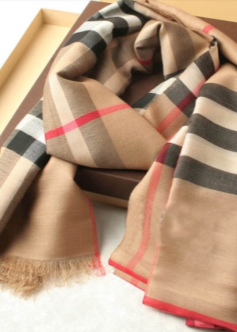 The model line of scarves of this brand can be divided into several categories. For starters, this is a classic of medium length and a rectangular shape. The traditional model is executed in several versions, differing in seasonality and color. For autumn and spring products, lighter materials are used, and as for the coloring, in addition to the world famous Burberry cage, there are many business plain colors. There are both female and male models, but in general they differ only in color options, therefore, if desired, you can purchase a thing from the male section.