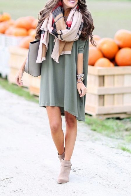 A large scarf can also be worn as an accessory if you beautifully tie it over an olive loose dress. In order not to be clumsy, shoes and bag are chosen in one neutral light gray tone.