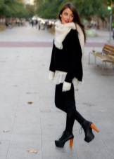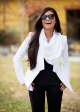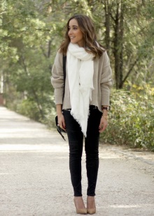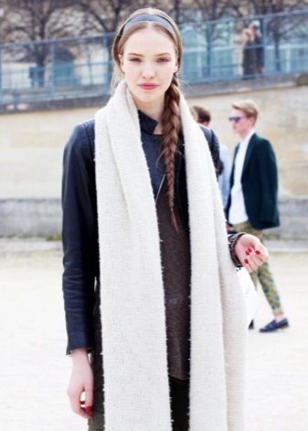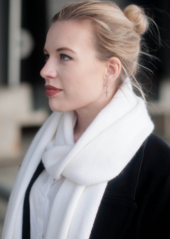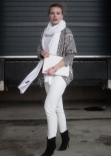 Attractive and versatile white scarves are perfectly combined not only with warm down jackets and jackets of various colors, but also with light windbreakers and leather jackets in brown and classic black. To create a more romantic and elegant look, you should pay special attention to the original combination of a white scarf and a long coat, which is complemented by a flirty hat in color.