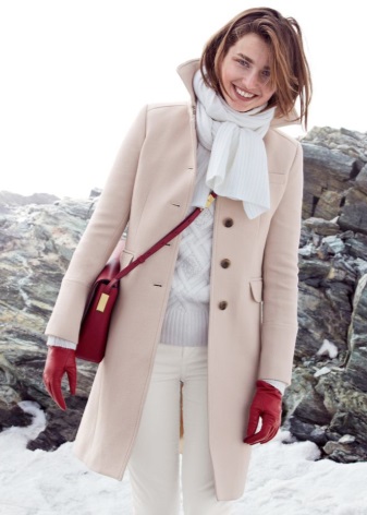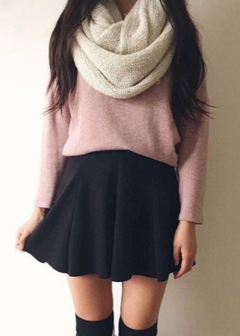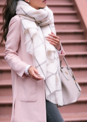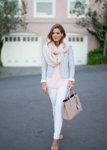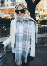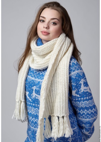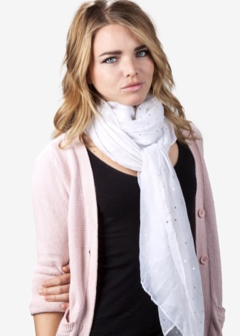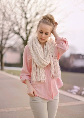 When choosing a scarf made of any material, it is worth remembering that models with lurex can add age. Scarves are ideal for creating a younger and more airy look, which are as tight as possible to the neck. Various patterns and embroideries on a warm accessory, as well as fringe and crystals will not interfere, in addition, white scarves with pompons look very interesting and coquettish.