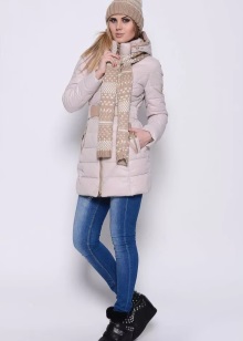 You can wear a beige knit scarf with down jackets. A hat and shoes harmoniously look in tone with a scarf.