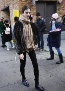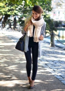 The beige scarf is in perfect harmony with black clothes. It can be safely worn with black jeans or trousers, a handbag and stilettos. Such an ensemble should be complemented with a blouse and a jacket in a beige hue. In this outfit, you can go to a meeting with friends or to work.