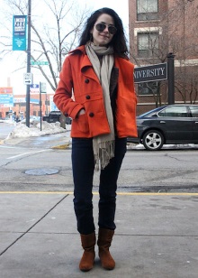 A beige scarf should not be combined with bright clothes. Such a tandem looks tasteless and ridiculous. The only exception to the rule is a red dress in an ensemble with a peach-beige shade.