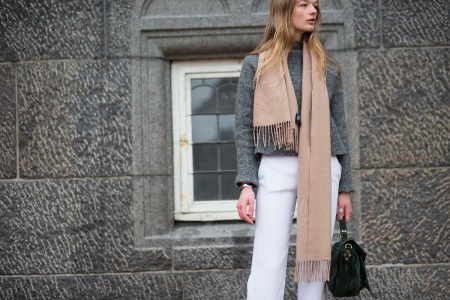 A beige scarf in combination with black clothes looks beautiful and stylish. It can be safely worn with gray wardrobe elements. The beige scarf against the background of dark shades looks expressive and charming.