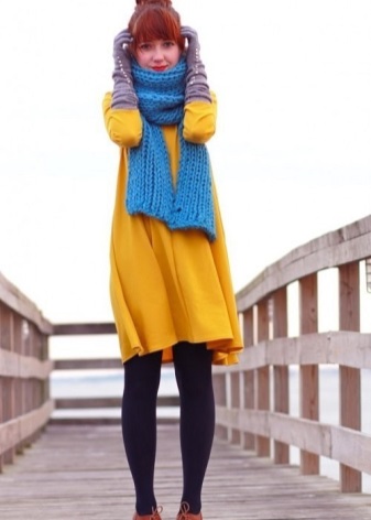 A thick simple dress in a gray, brown or beige shade in combination with a turquoise scarf can be an excellent option for every day.