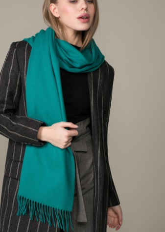 - The turquoise scarf can be safely combined with gray clothes. Such an ensemble is stylish, harmonious and fashionable.